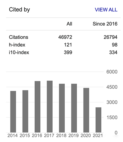 截止到今天,高会军的论文总引次数已经超过了4万,而H因子更是到达到了121: