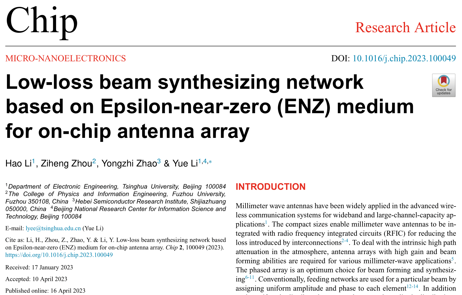 1. Li, H., Zhou Z., Zhao, Y. & Li, Y. Low-loss beam synthesizing network based on Epsilon-near-zero (ENZ) medium for on-chip antenna array. Chip 2, 100049 (2023).